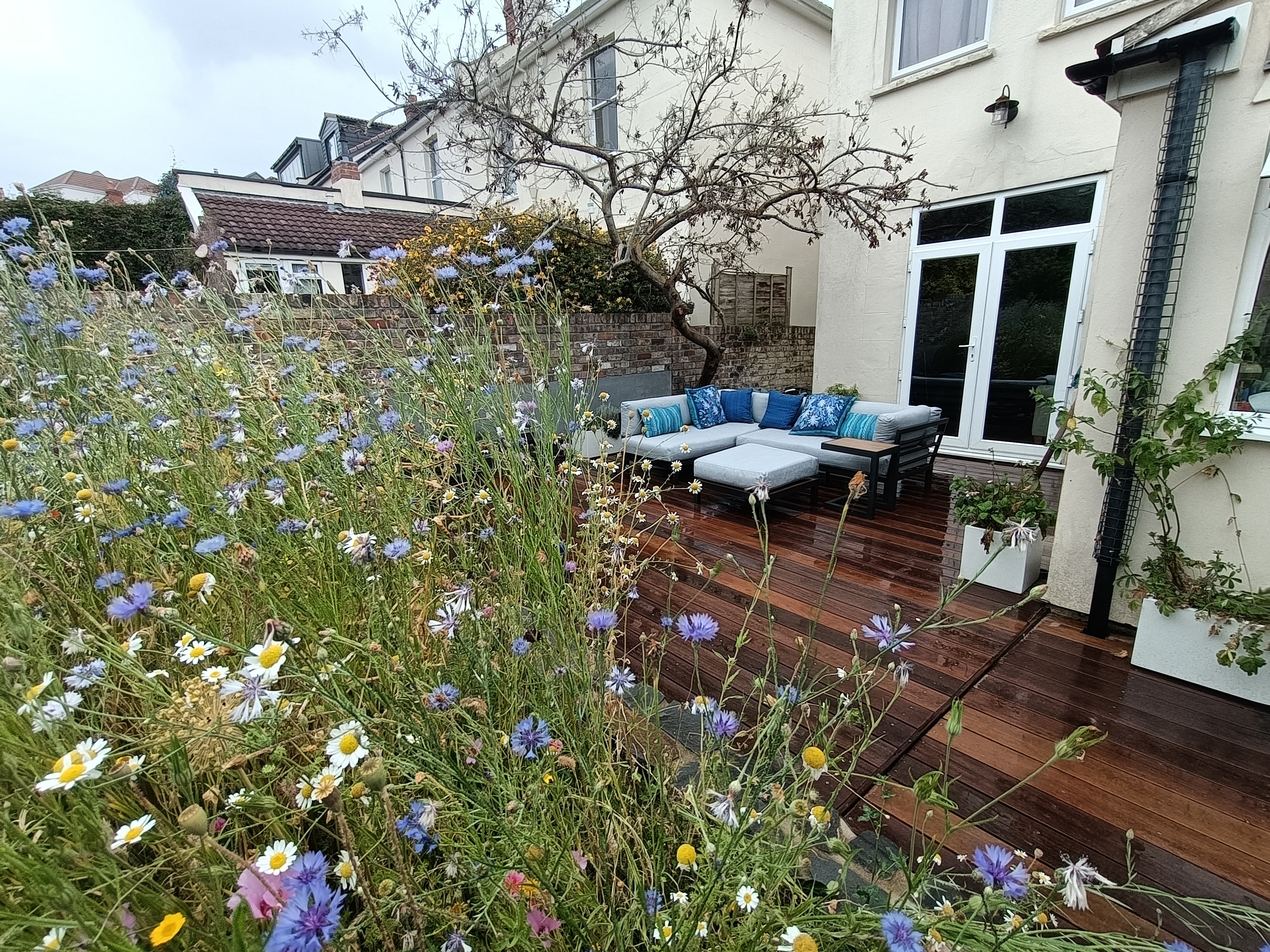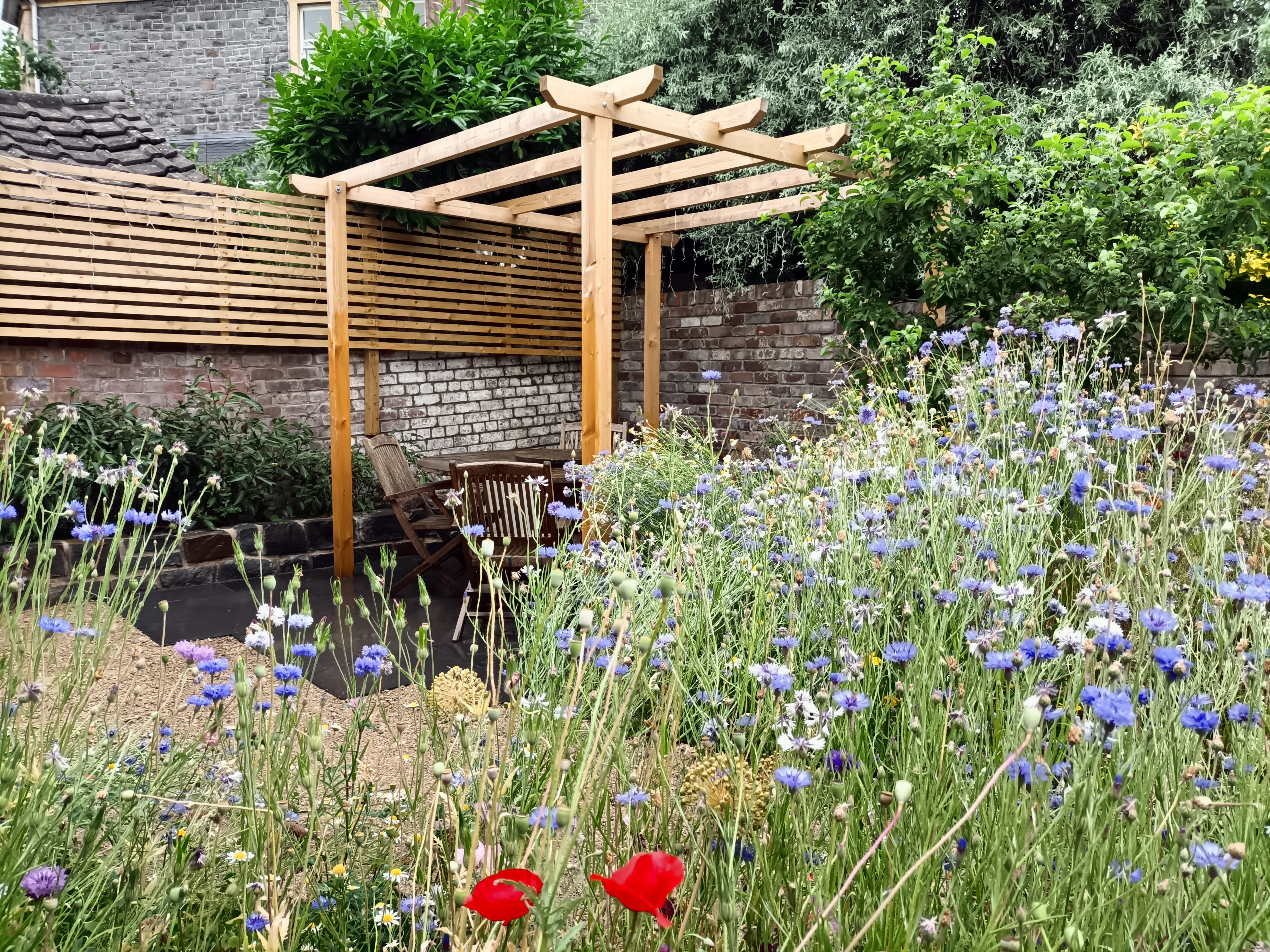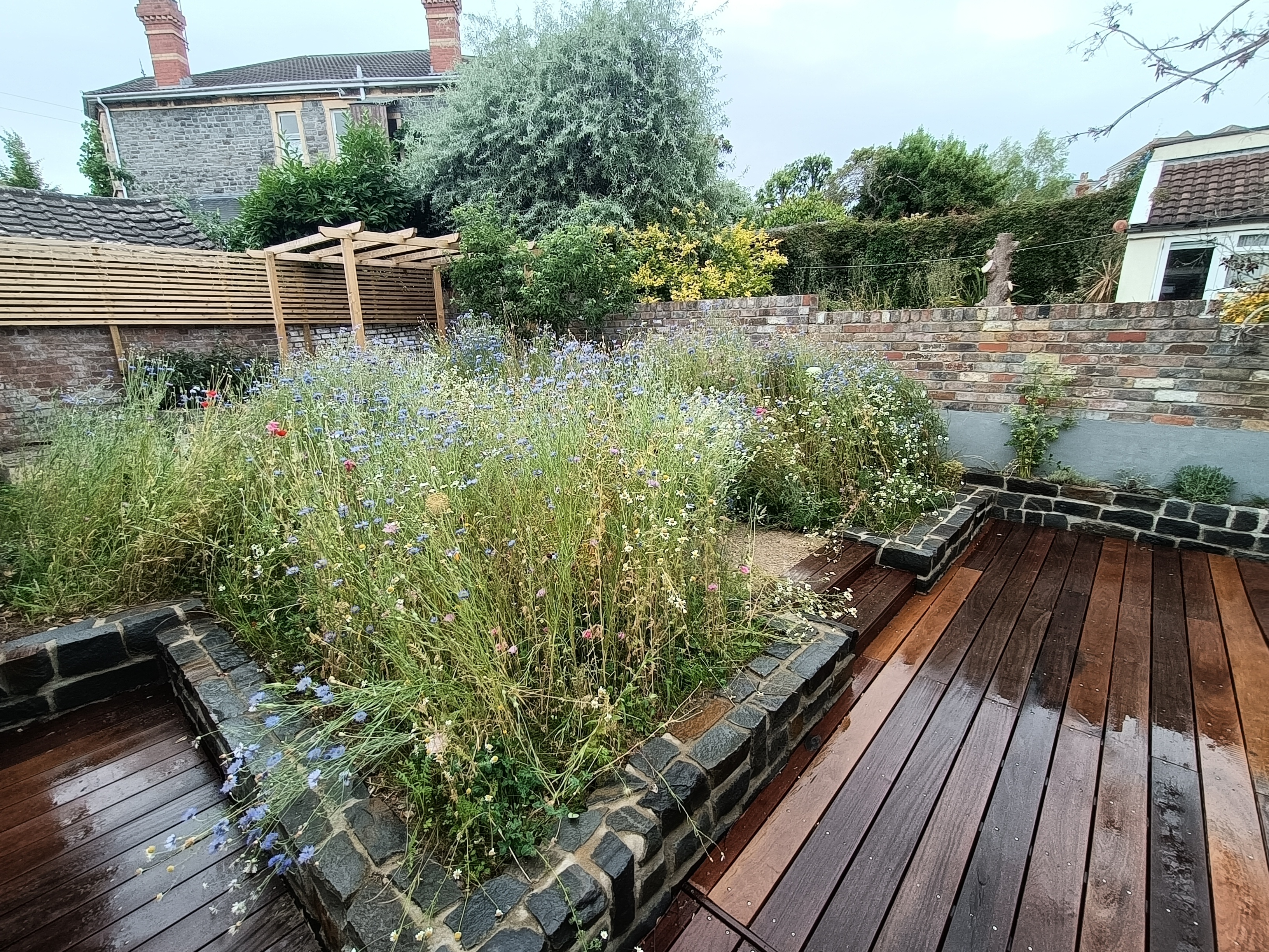 The garden was split into two distinct spaces; the area near the house used hardwood decking extending from the house to create a larger living space. Further from the house a wildflower meadow was created and edged with Welsh Blue Pennant stone, at the end of the garden we created a granite patio dining area with separated from the house by the meadow, existing crab apple and shade tolerant planting.