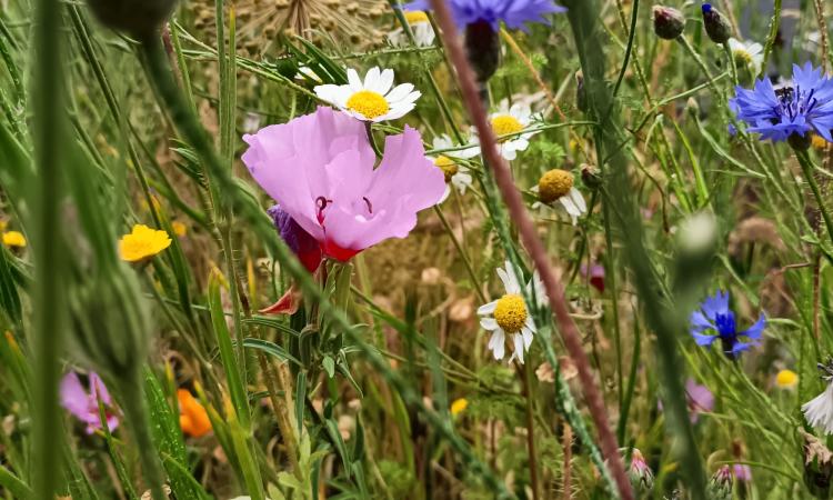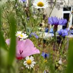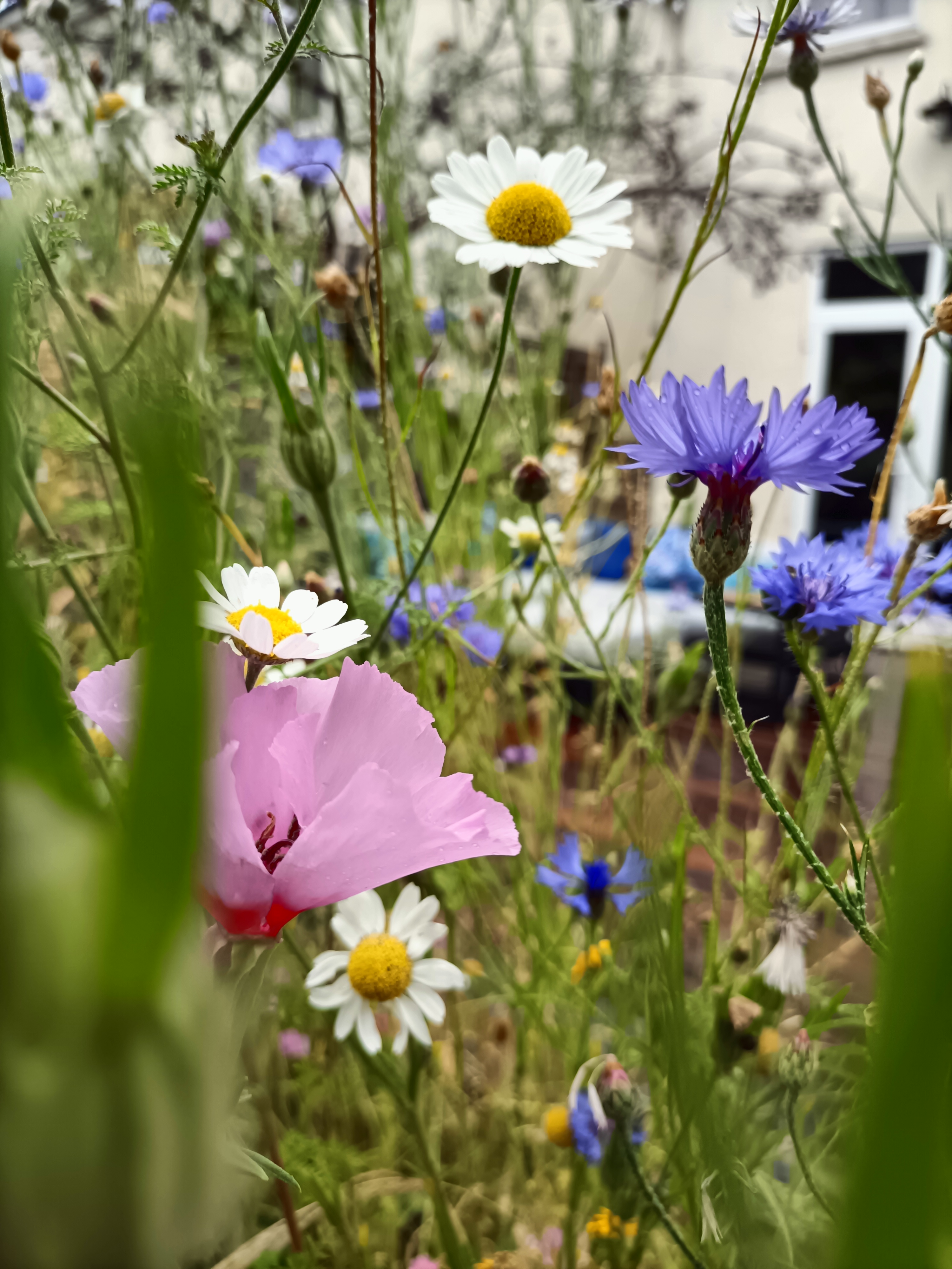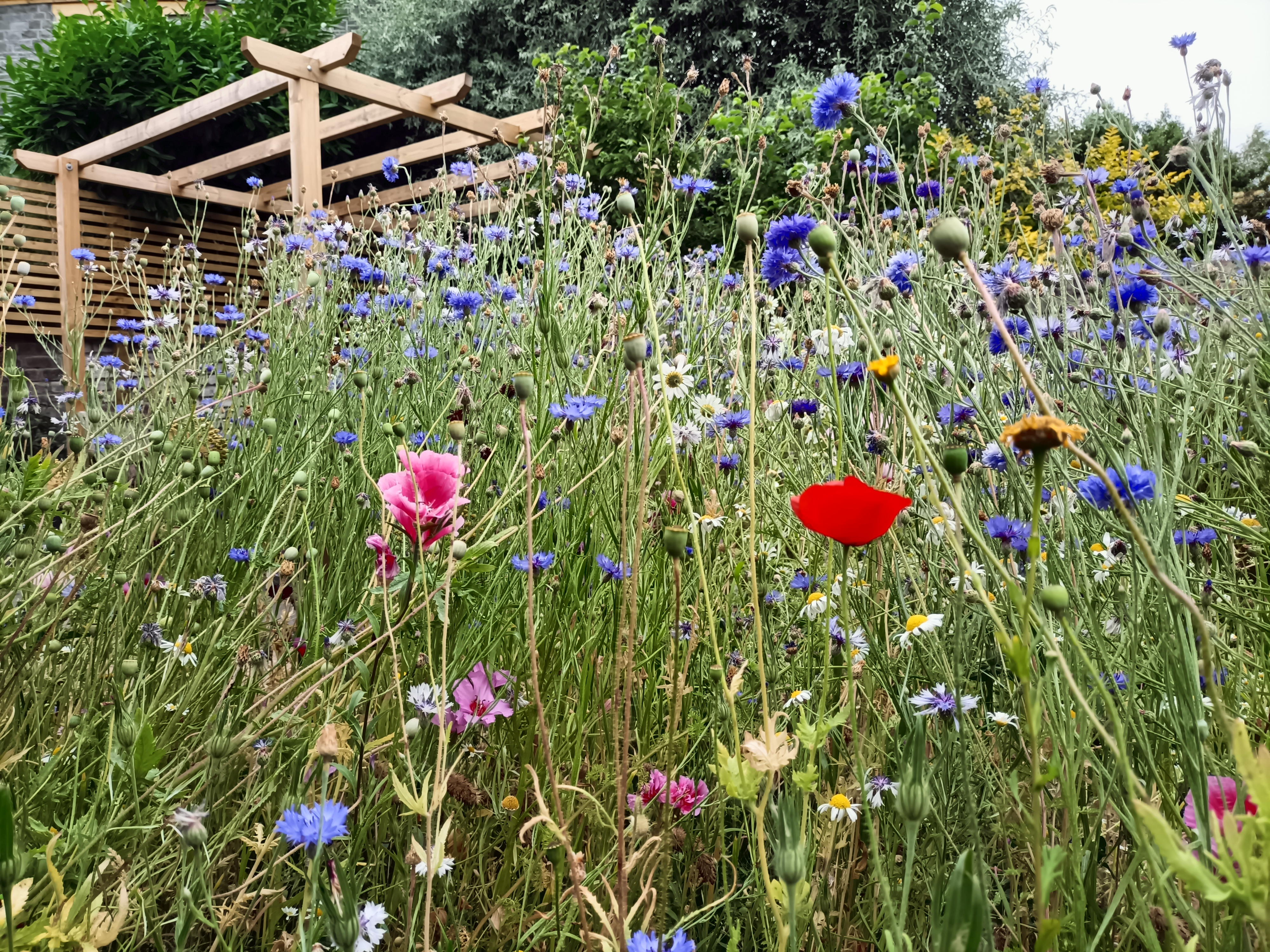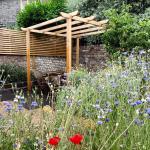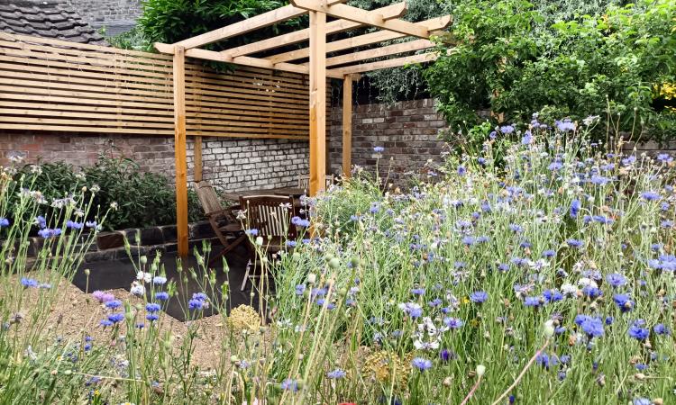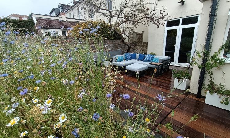 The garden was split into two distinct spaces; the area near the house used hardwood decking extending from the house to create a larger living space. Further from the house a wildflower meadow was created and edged with Welsh Blue Pennant stone, at the end of the garden we created a granite patio dining area with separated from the house by the meadow, existing crab apple and shade tolerant planting.